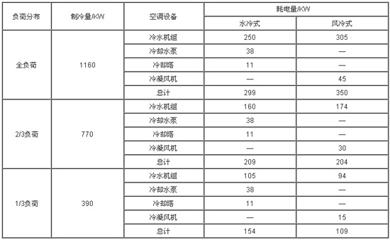 美國特靈公司曾做過水冷離心式冷水機組和風(fēng)冷離心式冷水機組在全負荷和部分負荷時的耗電量比較,現(xiàn)將該比較結(jié)果[以制冷量1160kw(330USRrt)為基礎(chǔ)]整理列出如下表,供參考。